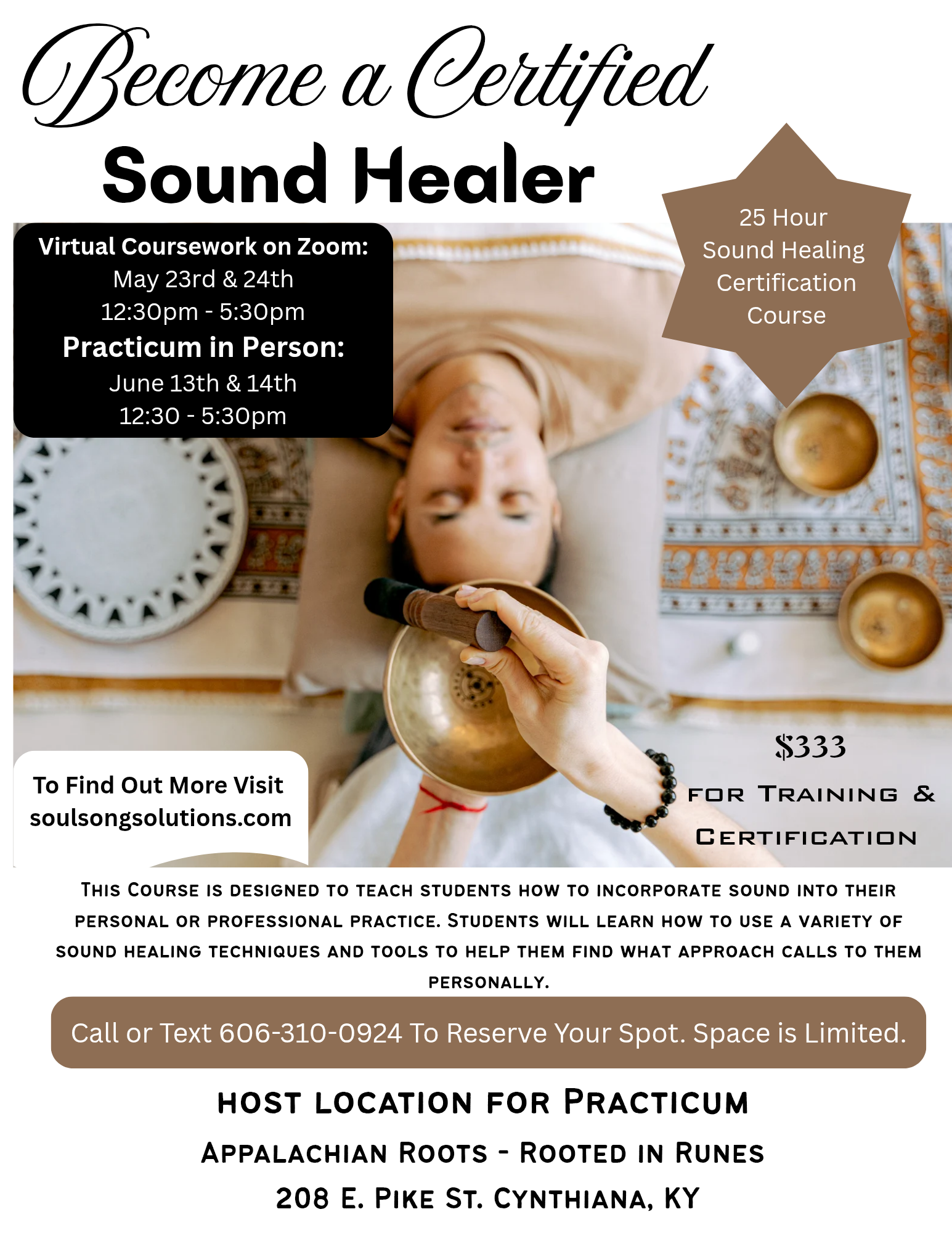 This course will be organized into two Weekends in May and June of 2026. The first half of the course will be held virtually on Zoom covering the science, history and various techniques of Sound Healing. The Second half of the course will be held in person to complete the required practicum to receive the certification. To fulfill all of the requirements of the certification course students will need to attend all classes, complete all assignments and demonstrate what they have learned in a practicum. The final exam and graduation will be held on June 14th 2026 on the New Strawberry Moon.